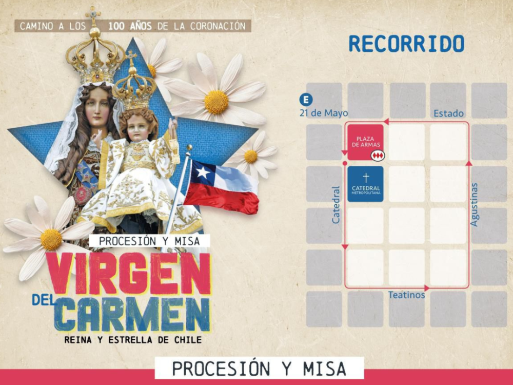 A nuestra Madre elevamos nuestras plegarias, regalamos vítores y hermosos cantos para tradición La Procesión de la Virgen del Carmen comenzará a las 15:30 hrs. desde la Catedral de Santiago.